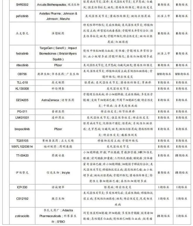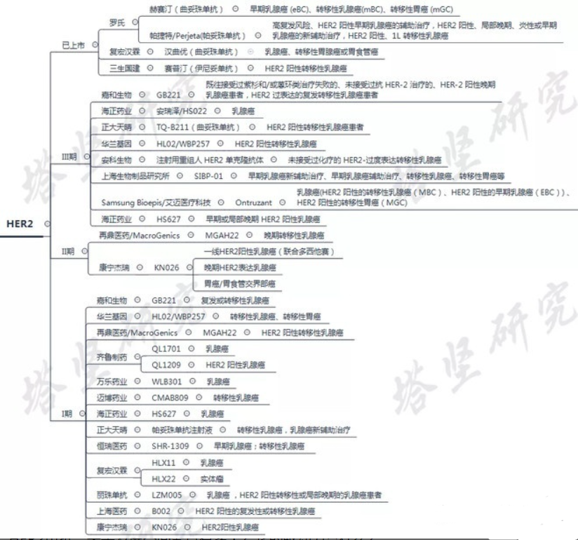 在2021年获得一级市场融资的生物医药研发型企业中,将同一靶点的融资额进行加和统计并排序,2021 年融资额 TOP10 靶点为: 数据来源:药渡集团 涉及上述十大靶点的在研品种共计 156 个,其一半以上处于临床Ⅰ期,具体情况如下: 1.2019-nCoV Spike glycoprotein靶点 针对新型冠状病毒肺炎,国内靶向 Spike glycoprotein 的临床在研产品共计 13 个(不含上市药物及已终止/无进展和临床前阶段),其中有 8 个已进展至临床 II 期,5 个尚处于临床 I 期。处于临床Ⅱ期的在研产品包括 Reluscovtogene ralaplasmid(疫苗)、Romlusevimab、Amubarvimab、DXP-593、BGB-DXP604、202-CoV(疫苗)、LY-CovMab、SCTV-01- C(疫苗)。处于临床Ⅰ期的药物包括 SCTA-01、Etesevimab、HLX-71、JMB-2002 及 JS-026。 该靶点总融资金额达到82.97亿人民币,涉及艾博生物和斯微生物等企业。这两家企业的主要技术方向都是 mRNA 及其递送系统。 从技术上讲,核酸药物的研发主要有三个壁垒:第一是原料端,包括 mRNA原料序列的筛选和修饰;第二是递送系统;第三是整个药物的生产工艺。 mRNA疫苗在近几年里取得了突破式发展,疫情促使 mRNA 疫苗成为资本密切关注的对象,mRNA疫苗也争气地展现了巨大的治疗潜力,未来还将用于治疗囊性纤维化、心脏病、罕见的遗传病,以及癌症、慢性疾病等。 2.SARS-CoV-2 SARS-CoV-2与 SARS-CoV 的基因组类似,但刺突蛋白(Spike protein或叫S蛋白)序列存在明显差异。SARS-CoV-2 传染性较高,其刺突糖蛋白(Spike glycoprotein)为治疗COVID-19 药物研发的重要靶点之一。 目前,由SARS-CoV-2引起的新型冠状病毒肺炎(COVID-19)仍处于全球大流行阶段。针对该疾病,中国现有 1 个申请上市品种,15 个临床Ⅲ期品种,29 个临床Ⅱ期品种,19 个临床Ⅰ期品种,以及 6 个临床申请品种。 该靶点总融资金额达到39.42亿人民币,涉及 SARS-CoV-2 药物研发的企业有丽珠单抗、三叶草生物和博安生物。据调研,三叶草生物利用自身 Trimer-Tag™技术平台,开发重组蛋白新冠疫苗,此类疫苗为基于 SARS-CoV-2 原始或变异毒株 S 蛋白的稳定的三聚体结构融合蛋白;珠海丽珠单抗正在研发重组蛋白新冠疫苗(V-01),该疫苗已在俄罗斯提交注册申请;博安生物正在开发靶向 SARS-CoV-2 S 蛋白的单抗(LY-CovMab)。 去年底,腾盛华创的新冠单克隆中和抗体安巴韦单抗/罗米司韦单抗联合疗法获 NMPA 的批准上市,填补新冠治疗的未满足临床需求,此外,体外嵌合病毒实验研究显示,该联合疗法保持对新型冠状病毒变异株奥密克戎(Omicron)的中和活性。 3. JAK靶点 JAK激酶是整个JAK-STAT信号通路的核心,而JAK-STAT信号通路是目前为数不多的已被阐明的免疫调节通路之一,如肿瘤、类风湿性关节炎、银屑病、血液系统疾病等在内的很多疾病,都被证明需要经过JAK-STAT信号通路的传输。因此从理论上看,能利用JAK抑制剂阻止细胞因子的表达,从而攻克那些困扰已久的疾病。 基于如此庞大的适用症范围,JAK成为全球最火热的靶点之一。截至目前,JAK家族一共发现了四个成员: JAK1:主要与急性淋巴细胞白血病、急性骨髓性白血病、实体器官恶性肿瘤相关; JAK2:主要与真性红细胞增多症、骨髓纤维化、原发性血小板增多症等疾病相关; JAK3:主要与急性巨幼细胞白血病、T细胞白血病和淋巴瘤等疾病相关; TYK2:主要与皮肤淋巴增殖性疾病、T细胞白血病相关。 目前,全球已有8款药物成功获批上市,辉瑞、礼来、诺华、艾伯维、吉利德等大型药企都投入到JAK靶点的研究中。 图:全球JAK抑制剂上市情况,源自氨基君 国内1 类临床在研品种中,JAK 靶点药物处于临床Ⅲ期的品种有 3个,处于临床Ⅱ期的有 6 个,处于临床Ⅰ期的有 12 个,处于临床申请阶段的有 2 个。目前,泽璟制药的杰克替尼、瑞石生物研发的SHR0302、信达生物与Incyte联合开发的itacitinib,几乎都处于临床III期,中国自主研发的第一款JAK抑制剂有望在它们之中产生。 图:JAK靶点在研公司及其产品(数据非最新) 4. HER2 靶点 HER2基因的异常现象存在于很多实体肿瘤中,据临床统计,乳腺癌和胃-食管癌存在HER2扩增或过表达,在卵巢癌、肺癌、膀胱癌、头颈癌中也发现有HER2过表达,针对HER2靶点设计的药物一直是研究热门。 HER2的治疗措施主要针对三个层面: HER2是单跨膜激酶,针对细胞外部分有:曲妥珠、帕妥珠和T-DM1、伊尼妥单抗、Phesgo等抗体类药物。 针对细胞内激酶部分:吡咯替尼、拉帕替尼、图卡替尼、来那替尼等小分子药物。 抗体偶联药物(ADC):通过使用单克隆抗体将细胞毒性药物递送至肿瘤。有Enhertu 等药物。 2020年6月,三生国健自主研发的伊尼妥单抗(赛普汀)在国内获批上市,打破了抗HER2单抗市场上进口药垄断的局面。2020年8月,复宏汉霖的曲妥珠单抗(汉曲优)也陆续上市。据不完全统计,目前国内 1 类临床在研品种中,HER2 靶点在研产品中,处于临床Ⅲ期的有6 个,处于临床Ⅱ期的有 11 个,处于临床Ⅰ期的有 24 个,处于临床申请阶段的有 3 个。 图:HER2 靶点在研药物,源自塔坚研究早期数据 全球ADC药物研发进入爆发期也带上了HER2 靶点玩,BAT8001 是百奥泰自主研发的首个HER2抗体偶联药物(ADC),但去年宣布投入2.26亿研发费用打水漂。 5. CD19 靶点 近年来,CD19 作为 B 细胞恶性肿瘤免疫治疗的分子靶点受到极大的关注,CD19靶点布局涉及 ADC、单抗、双抗、CAR-T 等领域,热度堪比 PD-1。以 CD19 为靶点治疗血液肿瘤的药物逐步崭露头角,并有望成为主流的临床治疗方法。 以CAR-T靶点研究为例,我国以CD19