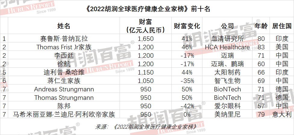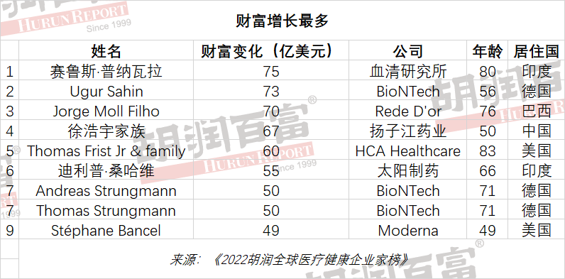 2022年3月31日,胡润研究院发布《2022胡润全球医疗健康企业家榜》(Hurun Global Healthcare Rich List 2022),列出了全球前100名医疗健康行业的企业家,他们的财富主要来源于医疗健康行业。财富数字来源于胡润研究院最近发布的《2022家大业大酒·胡润全球富豪榜》,财富计算的截止日期为2022年1月14日。 胡润百富董事长兼首席调研官胡润表示:“胡润百富致力于通过有质量的榜单和调研,发现企业价值,弘扬企业家精神。我们这二十多年来,一直在为创业者讲故事。接着我们最近发布的全球富豪榜,我们聚焦几个领域,首先是白手起家U40,然后是白手起家女性,今天,特别是在疫情两年之后,我们来关注医疗健康行业,发布这个全球医疗健康行业的企业家百强榜,希望通过这些企业家的故事,能带给大家一些启发,了解全球医疗健康行业的变化和趋势。” 在最近发布的胡润全球富豪榜上,医疗健康行业排名第二,首次超过房地产行业。 在医疗健康榜中。上榜门槛为190亿元人民币,全球前100名医疗健康行业的企业家总财富4.6万亿元。中国以39位成为全球医疗健康企业家的中心,其次是美国16位,瑞士15位,德国11位,印度9位。 “很多人可能会感到意外,中国企业家在这个百强榜的数量,差不多是美国、瑞士和德国三个国家加在一起。在我们全球富豪榜上,医疗健康行业十年前排在前五名以外,现在已经是金融服务之外的第一大行业,而在我们中国500强最具价值非国有企业榜单上,医疗健康行业已经排名第一。其中一个原因可能是因为中国像世界一样面临老龄化问题。” 全球前100名医疗健康行业的企业家中,从事制药领域的最多,有55位;其次是医疗器械领域,有21位;第三是生物科技领域,有16位。 居住在中国的39位医疗健康行业企业家中,也是从事制药领域的最多,有20位,占比51%;其次是生物科技领域,有10位,占比26%;第三是医疗器械领域,有6位,占比15%。 榜 单 《2022胡润全球医疗健康企业家榜》top10: 前十名门槛为950亿元。4位来自中国,印度和德国各2位,美国和意大利各1位。 印度“疫苗之王”血清研究所80岁的赛鲁斯·普纳瓦拉以1650亿元的财富成为全球医疗健康行业首富,比去年增长41%。印度血清研究所是全球产量最大的疫苗生产商,以其Covishield新冠疫苗而闻名,该疫苗占到印度迄今共接种13亿剂疫苗的90%。 美国“医院大王”HCA医疗集团83岁的Thomas Frist Jr及其家族以1200亿元的财富位列第二,比去年增长46%。HCA在美国 20个州和英国经营着186家医院和2000多个护理场所。HCA致力于利用数据和技术来辅助现代医疗服务。2011年,在两次管理层收购之后,他让公司第三次上市。 迈瑞71岁的李西廷和60岁的徐航分别以1200亿元的财富并列第二,比去年减少17%。迈瑞医疗产品覆盖三大领域,包括生命信息与支持、体外诊断以及医学影像。去年前三季度实现营业收入194亿元,净利润66亿元。 印度太阳制药66岁的迪利普·桑哈维以1150亿元的财富位列第五,比去年增长44%。桑哈维一开始是帮助他父亲经营药品批发业务。1982年,27岁的桑哈维开设了他的第一个制造部门,并在一系列收购之后发展了公司。 智飞生物69岁的蒋仁生及其家族以1050亿元的财富位列第六,比去年减少35%。智飞生物是一家集疫苗、生物制品研发、生产、销售的生物高科技企业。去年全年实现营业收入306亿元,同比增长102%;归属于上市公司股东的净利润102亿元,同比增长209%。 德国疫苗生产商BioNTech 71岁的Andreas Strungmann和Thomas Strungmann分别以950亿元的财富位列第七,比去年增长50%。这对双胞胎兄弟2005年出售了他们二十多年前成立的一家生产降胆固醇药物的企业,开始投资医疗健康行业,其中最成功的是BioNTech。BioNTech与辉瑞联合开发了美国的第一个新冠疫苗。 爱尔眼科57岁的陈邦以950亿元的财富并列第七,比去年减少42%。爱尔眼科主要从事各类眼科疾病诊疗、手术等服务。截止2020年年底,公司在中国境内开办医院146家,门诊部88家。 意大利药企美纳里尼79岁的马希米丽亚娜·兰迪尼·阿利欧帝及其家族以950亿元的财富并列第七。她是全球医疗健康行业的女首富。2014年,她和她的三个孩子从她已故的丈夫阿尔贝托·阿列奥蒂那里继承了美纳里尼。美纳里尼集团遍布140个国家,其18个生产基地每年生产6亿包药品。 财富增长最多: 最年轻: 女性Top 10: 特色人物: 华熙生物56岁的赵燕及其家族以480亿元的财富位列第32位。华熙生物是集研发、生产和销售于一体的透明质酸全产业链平台公司。2021财年,公司实现营业收入49亿元,同比增幅88%;实现归属于上市公司股东的净利润7.8亿元,同比增幅21%。 神州细胞的谢良志、李翰园夫妇以315亿元的财富位列第56位。神州细胞专注于单克隆抗体、重组蛋白和疫苗等生物药产品,公司自主研发的首个产品安佳因于去年7月获批上市。神州细胞2018年首次进入胡润中国独角兽榜,2020年成功上市。 完整榜单: |