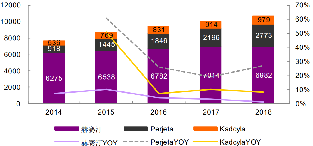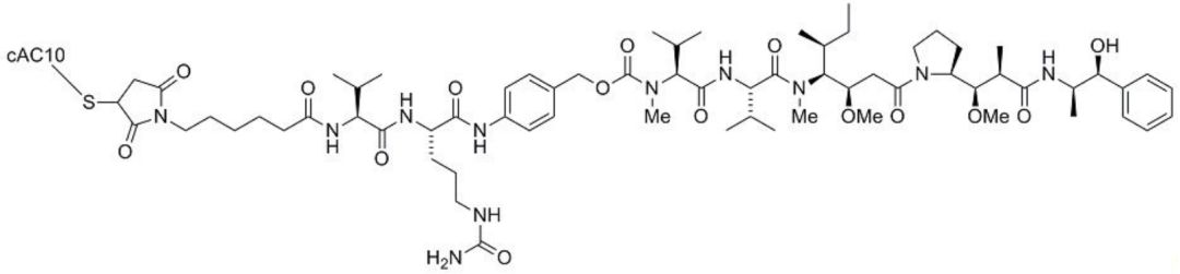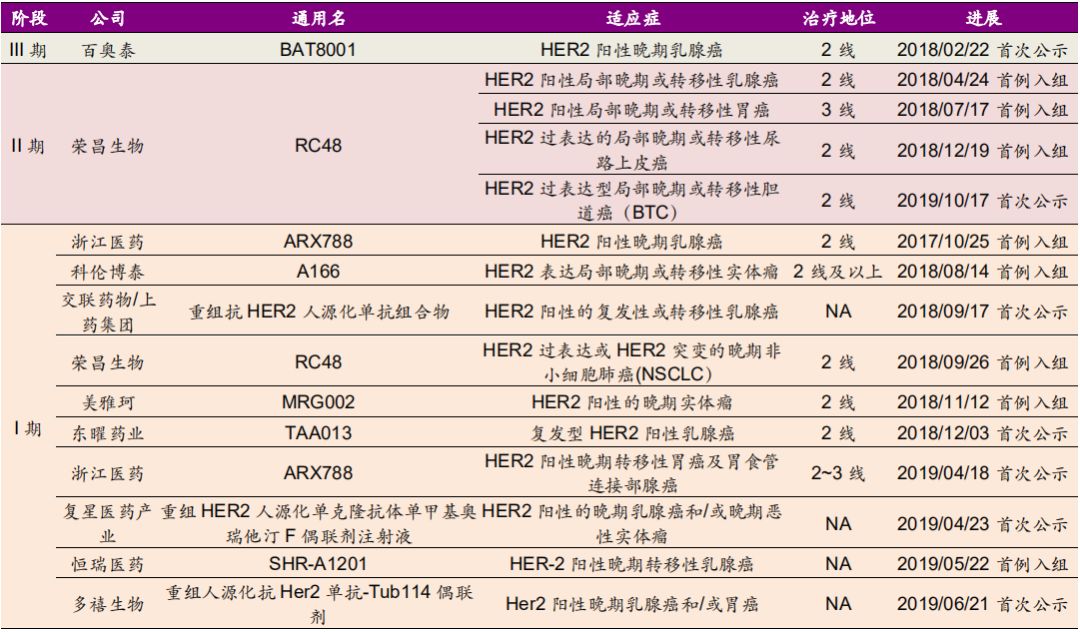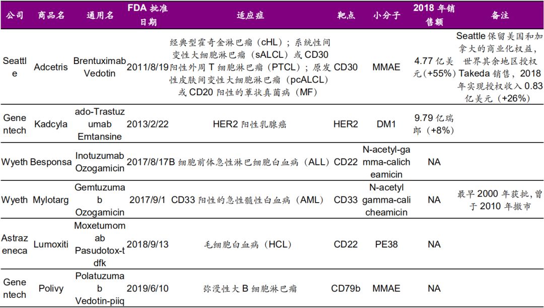 毋庸置疑,抗体偶联药物(ADC)已经成为当前全球抗体药物研发的热门方向,它的春天已经到来! 从第一个ADC药物(Mylotarg)被FDA批准(2000年)至今已经有19年时间,研发到临床的路径无比艰难,期间被酪氨酸激酶(TKIs)、PD-1/PD-L1抑制剂和CAR-T的热浪不断冲击,但是科学家和临床医生始终没有放弃ADC这个品类药物的研发。 截至2019年11月,FDA共批准了6款ADC药物上市,包括Seattle的Adcetris、Genentech的Kadcyla和Polivy、Wyeth的Besponsa和Mylotarg。 其中,代表产品——抗CD30的Adcetris在2018年实现销售收入4.77亿美元(同比增长55%),抗HER2的Kadcyla则实现销售收入9.79亿瑞士法郎(同比增长8%)。 ADC药物发展史:从学术到临床应用 早在20世纪初,以“化疗之父”保罗·埃利希(Paul Ehrlich)为代表的医药学家们提出了“魔法子弹”的推论,旨在寻找一种化合物能够选择性靶向致病有机体而不产生其他副作用。 而真正意义上的ADC概念诞生于1958年,但当时技术比较落后,无论是细胞毒药物的活性、抗体技术还是接头连接技术都不成熟,直到1975年,第一个现代版的ADC才被报道。 2000年,首个ADC药物才被FDA批准上市,是由Wyeth研发的Mylotarg(Gemtuzumab Ozogamicin)。但是该药物在上市后的临床研究中联用化疗未能延长生存期且增加了毒性,因此2010年由企业主动撤市。Mylotarg上市后的10余年间未再有新的ADC获批。 随着技术进步,ADC类药物毒性逐渐可控、安全性逐步提升。2011年获批的Adcetris和2013年获批的Kadcyla催化ADC研发热度升温,全球数十个药物陆续投入研发。 随着人源化靶向抗体的开发、细胞毒药物活性的提高、新型接头稳定性以及裂解效率的增强,ADC的发展也进入黄金时期,药物趋向于均一性和稳定性提升,药效增强。 现阶段唯一实体瘤ADC—Kadcyla Kadcyla(ado-trastuzumab emtansine)是由靶向HER2的曲妥珠单抗,与微管抑制剂DM1(一种美登素衍生物)通过MCC linker连接而成的ADC药物。 其中,曲妥珠单抗通过CHO细胞表达,MCC与DM1通过化学合成方法生产,平均每个抗体上连接3.5个DM1。 该药物于2013年获FDA批准上市,原研企业为罗氏旗下的Genentech。 2018年,Kadcyla实现销售收入9.79亿瑞士法郎,同比增长8%,在罗氏抗HER2抗体组合中占比9%。 目前,罗氏已经凭借曲妥珠单抗+帕妥珠单抗+Kadcyla完备构建了包含新辅助、辅助、一线、二线全流程的抗HER2靶向治疗,其中Kadcyla即定位于早期剩余侵袭性病灶的辅助治疗和转移性患者的二线治疗,竞争格局良好,临床刚需强劲。 值得一提的是,EMILIA临床试验(NCT00829166)结果显示,Kadcyla组 vs 拉帕+卡培组获得更优的治疗效果: 该试验结果表明,Kadcyla相比拉帕替尼+卡培他滨有更优秀的HER2阳性乳腺癌二线治疗获益,奠定了其临床治疗的强势基础。 此外,Kadcyla还展现出良好的安全性,发生率较高的3-4级不良反应包括血小板减少(15%)、转氨酶增加(8%),整体不良反应情况较为可控,安全性可接受。 血液瘤ADC代表—Adcetris Adcetris(Brentuximab Vedotin)是一种靶向CD30的抗体偶联药物,其组成部分包括: 其分子量约为153kDa,平均每个抗体分子链接4个MMAE,抗体通过CHO细胞生产,小分子通过化学合成,然后将二者通过Linker进行连接。 CD30主要在霍奇金淋巴瘤和间变性大细胞淋巴瘤中进行表达,在正常组织中表达量较低,是理想的肿瘤靶向治疗靶点。 截至2019年10月,Adcetris获得FDA批准的适应症包括: 在2011年获批上市后,Adcetris销售收入持续增长,其中原研企业Seattle负责美国、加拿大地区的销售,2018年实现销售收入4.77亿美元,授权武田进行全球其他地区的销售,2018年获得授权收入0.83亿美元。 国内部分ADC先锋 恒瑞医药:广谱抗癌和克服EGFR-TKI耐药潜力的SHR-A1403 ADC类药物发挥作用仅需要抗原高表达和介导毒性小分子内吞,理论上可解决普通抗体在c-Met靶点的成药性问题。抗c-Met的ADC有望成为治疗窗大、安全性好的广谱抗癌药。 截至2019年11月,国内抗c-Met抗体药物推进至临床阶段的包括岸迈生物的EMB-01和恒瑞医药的SHR-A1403,处于IND或临床前阶段的有恒瑞医药(美国临床)、复宏汉霖、贝达药业等企业。其中恒瑞的SHR-A1403是唯一的ADC药物,于2019年2月完成国内I期临床的首例患者入组,2017年1月获得FDA批准临床。 对于EGFR阳性的非小细胞肺癌(NSCLC)患者,EGFR-TKI治疗普遍存在耐药问题,而大多数耐药肿瘤细胞中都会过表达c-Met,SHR-A1403则在临床前动物试验中克服了该耐药问题。未来SHR-1403有望成为EGFR-TKI耐药后c-Met阳性患者的新治疗选择。 浙江医药:与Ambrx合作开发me-better潜力的ADC 自2013年开始,浙江医药通过与美国Ambrx公司(拥有国际一流的蛋白质技术)进行合作进军ADC领域。 传统ADC是由疗效和毒性不等的偶联混合物组成。目前,通过定点偶联来获得单一ADC纯品已成为ADC领域新的研发方向。Ambrx的ADC是通过定点嵌入非天然氨基酸来实现在单克隆抗体上定点、定量接入抗肿瘤的小分子药物,以获得单一的ADC纯品。这相当于在“生物导弹”上精确地装上了“核弹头”,使得治疗更加安全、有效、定向。 2019年10月22日,浙江医药下属新码生物与Ambrx签订协议,合作研发并商业化许可CD70-ADC——ARX305产品。 目前国外有多款针对CD70的单克隆抗体或ADC药物处于临床研究状态,尚未有相关药物上市;国内也尚未有针对CD70的单克隆抗体或ADC的临床注册记录。 目前ARX305在美国处于临床前研究阶段,新码生物将逐步开展国内研发工作。 其他ADC概览 国内还有很多ADC先锋,比如: 国内首个进入III