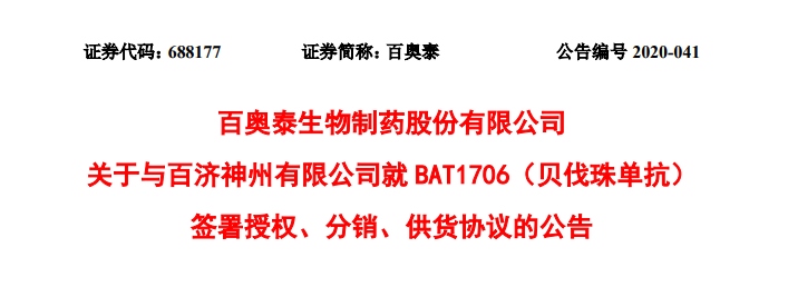 获取更多资讯 记得先点蓝字关注会会药咖~ 京新药业:EVT201胶囊(失眠障碍)Ⅲ期已有两例受试者成功入组 上海医药:溴吡斯的明片及卡马西平片获得药品生产许可证 美康生物:同型半胱氨酸检测试剂盒取得医疗器械注册证 爱朋医疗:半年度报告(营业收入 -20.59% 净利润 -20.32% ) 山河药辅:半年度报告(营业收入 15.71% 净利润 21.90% ) 南京医药:半年度报告(营业收入 2.00 %净利润 8.11 %) 九典制药:半年度报告(营业收入-7.71% 净利润 15.08% ) 东阳光:半年度报告(营业收入-19.51% 净利润 -58.57 %) 万东医疗:半年度报告(营业收入 33.03 %净利润 137.25 %) *ST华塑:半年度报告(营业收入 -42.12% 净利润 17.20% ) 新产业:半年度报告(营业收入31.06% 净利润 40.57% ) 联环药业:半年度报告(营业收入 11.05% 净利润 9.03 %) 陇神戎发:半年度报告(营业收入-13.55% 净利润-231.05% ) 片仔癀:半年度报告(营业收入 12.16 %净利润 15.84 %) ST运盛:半年度报告(营业收入 -54.02%,利润增长1674.94万元) 南新制药:头孢克洛胶囊拟中标第三批全国药品集中采购 以岭药业:盐酸二甲双胍片、卡托普利片和盐酸环丙沙星片拟中选全国药品集中采购 中国医药:盐酸二甲双胍缓释片,非那雄胺片拟中标全国药品集中采购 太极集团:氢溴酸西酞普兰片拟中标第三批药品集中采购 信立泰:替格瑞洛片地氯雷他定片匹伐他汀钙片拟中标采购 信诺维完成10亿元人民币C轮融资,4个产品进入国内外临床阶段 今日,苏州信诺维医药科技有限公司(以下简称“信诺维”)宣布成功完成了10亿元人民币的C轮融资,募集资金将主要用于产品研发和生产基地的建设。本轮融资由正心谷创新资本与国际知名长线基金联合领投,海松资本、中金资本旗下中金启德基金、芯云资本、久友资本、德观资本等多家知名机构共同参与。 信诺维成立于2016年,是一家聚焦重大未满足临床需求并拥有全球知识产权的创新药公司。信诺维以苏州总部为依托,建立了北京、上海、澳洲、波士顿四个分支机构,构建了一个完整的全球研发和生产体系,团队囊括业内顶尖的科研、临床、生产和销售人才,多次获得苏州独角兽培育企业、江苏省双创计划、姑苏领军人才等重要奖项。 公司围绕成熟靶点新一代best in class产品和全新靶点first in class产品两个战略维度进行了一系列布局,目前已有4个产品进入国内外临床阶段,另有4款产品处于IND enabling阶段,覆盖肿瘤、抗感染、代谢、自身免疫等重大领域。 裕策生物完成近3亿元人民币C轮融资,打造肿瘤精准免疫诊疗一体化解决方案 深圳裕策生物科技有限公司(简称:裕策生物)近日宣布完成近3亿元人民币C轮战略融资,由元知科技医疗领投,普华资本追加跟资,探针资本担任独家财务顾问。本轮融资所得主要用于扩大市场覆盖,推动TMB检测大panel产品报证,建立市场化的肿瘤免疫药企临床研究服务平台。 裕策生物成立于2015年,致力于解决肿瘤免疫治疗领域临床端和药企端未满足的需求,公司拥有国际一流的新生抗原检测和鉴定平台、专业的肿瘤免疫生信解读数据库、国内最大肿瘤免疫诊疗真实世界研究数据库,依托国际高标准的研究和生产质量体系以及经验丰富的管理运营团队,为肿瘤患者提供临床可及的用药指导检测产品,为药企提供高质量的诊断生物标志物和治疗靶点开发服务。 1.65 亿美元!百济神州获百奥泰「贝伐珠单抗生物类似药」中国权益 8 月 24 日,百奥泰发布公告,与百济神州签署授权、分销、供货协议,将公司BAT1706 (贝伐珠单抗生物类似药)相关知识产权及其在中国地区(包括中国大陆、香港特别行政区、澳门特别行政区、台湾,下同)的产品权益有偿许可给百济神州。 交易标的名称:BAT1706 相关知识产权及其在中国地区的产品权益; 协议类型:授权、分销、供货协议; 交易金额:首付款及里程碑款总金额最高至 16,500 万美元,其中包括 2,000 万美元首付款、累计不超过 14,500 万美元里程碑付款和两位数百分比的销售提成。 协议生效条件:经双方签订盖章并经百奥泰董事会、股东大会审议通过后生效。 协议履行期限:自本协议生效之日起,持续有效至 BAT1706(贝伐珠单抗)获国家药品监督管理局上市批准之后 15 年,期限届满后,双方可共同协商延长。 BAT1706 是百奥泰根据中国 NMPA、美国 FDA 和欧盟 EMA 生物类似药相关指导原则开发的贝伐珠单抗注射液,是一款靶向血管内皮生长因子 (VEGF) 的人源化单克隆抗体。可以特异性地与 VEGF 结合,阻断 VEGF 与其受体结合从而减少新生血管生成诱导现有血管的退化从而抑制肿瘤生长。贝伐珠单抗原研药在欧美获批的适应症包括转移性结直肠癌、晚期非鳞状非小细胞肺癌、肾细胞癌、卵巢癌、宫颈癌、恶性胶质瘤等。 Insight 数据库显示,百奥泰 BAT1706(贝伐珠单抗)的已在今年 6 月报上市,目前处于新报任务排队审评中,据悉本次申报的适应症包括晚期、转移性或复发性非小细胞肺癌和转移性结直肠癌。 港大首次确认新冠康复者"再感染"病例 THE END 欢迎留言沟通路演、创投对接 你在看吗? |